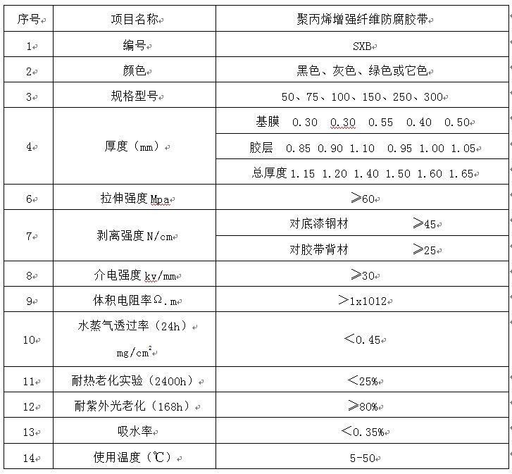 該產(chǎn)品基材為獨(dú)特的改性聚丙烯編織纖維布,采用丁基橡膠改性瀝青做防腐膠層。其基材是纖維結(jié)構(gòu)可有效地抵抗由于土壤應(yīng)力而產(chǎn)生的蠕變破壞,經(jīng)老化試驗(yàn)檢測證明其耐蝕壽命達(dá)50年以上,各項(xiàng)檢測指標(biāo)大大高于SY/T0414—98標(biāo)準(zhǔn)要求,完全達(dá)到美國ANSI/AWWAC209-00和NACEMR0274-95指標(biāo)。是管道冷防腐施工膠帶中的佳選擇,也是防腐經(jīng)濟(jì)的選擇。